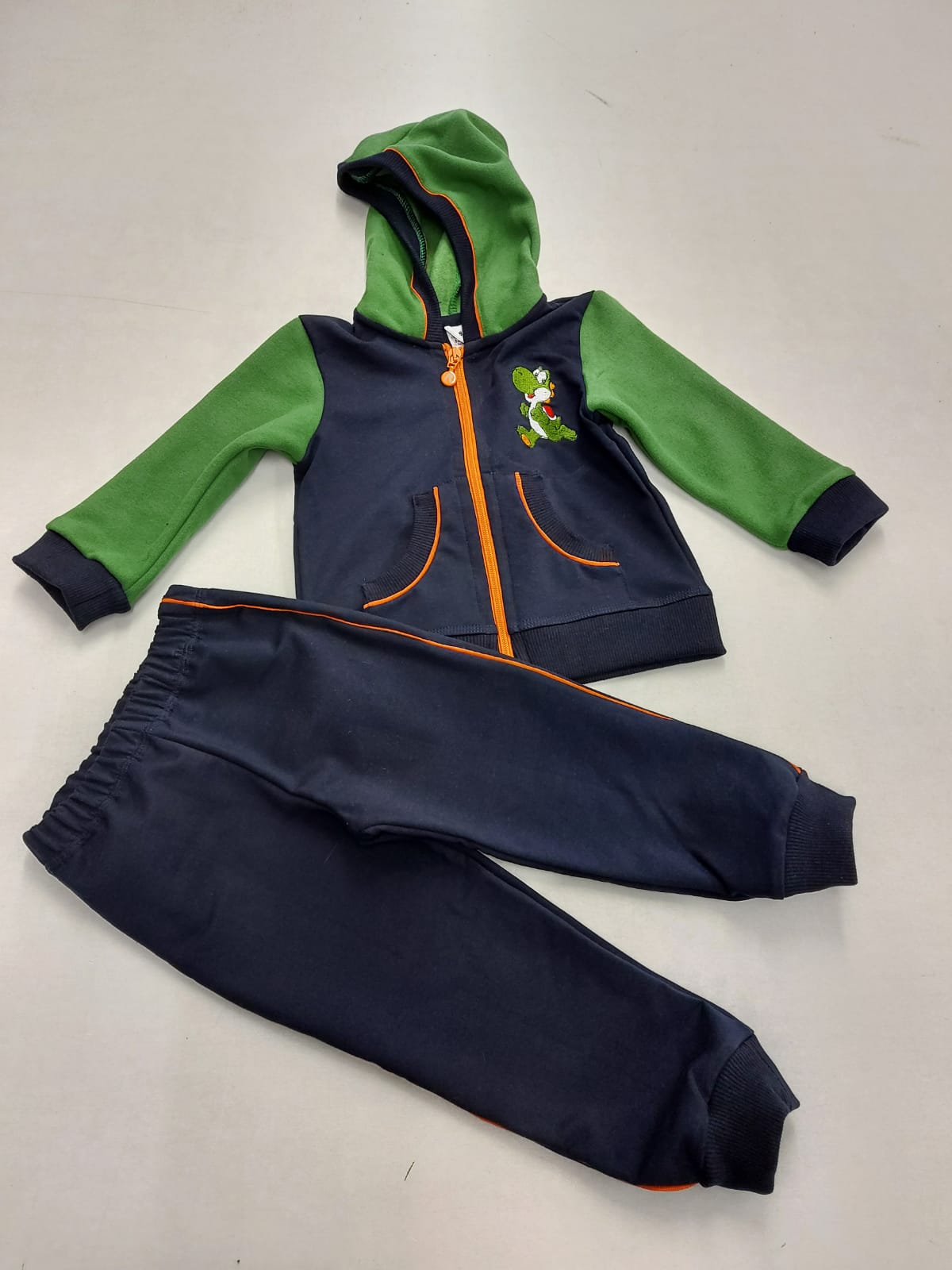 Djecji komplet sa štikom dinosaura . Sastav materijala je 95 % pamuk i 5 % elastan. Jaknica sa kapuljačom dugih rukava i pamučna trenirka.